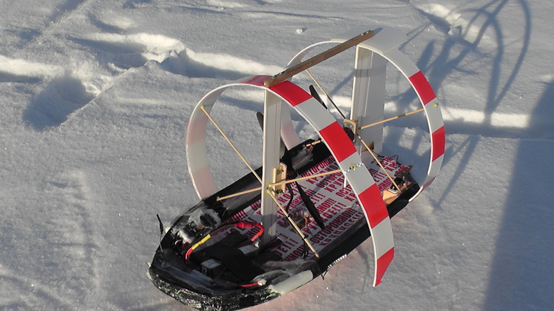 Во всей красе идея показывает себя, если гонять аэробот на неглубоком снегу, сантиметров 5-6. Если снег глубже, и очень рыхлый, то появляются проблемы. И с опрокидыванием на «ровный киль» - дуги не помогают, они зарываются в рыхлый снег, и с реверсом – воткнувшись со всей дури носом в снег, аэробот настолько плотно в него «закапывается», что порой никаким реверсом его оттуда не выдернуть. Вот как это выглядит: