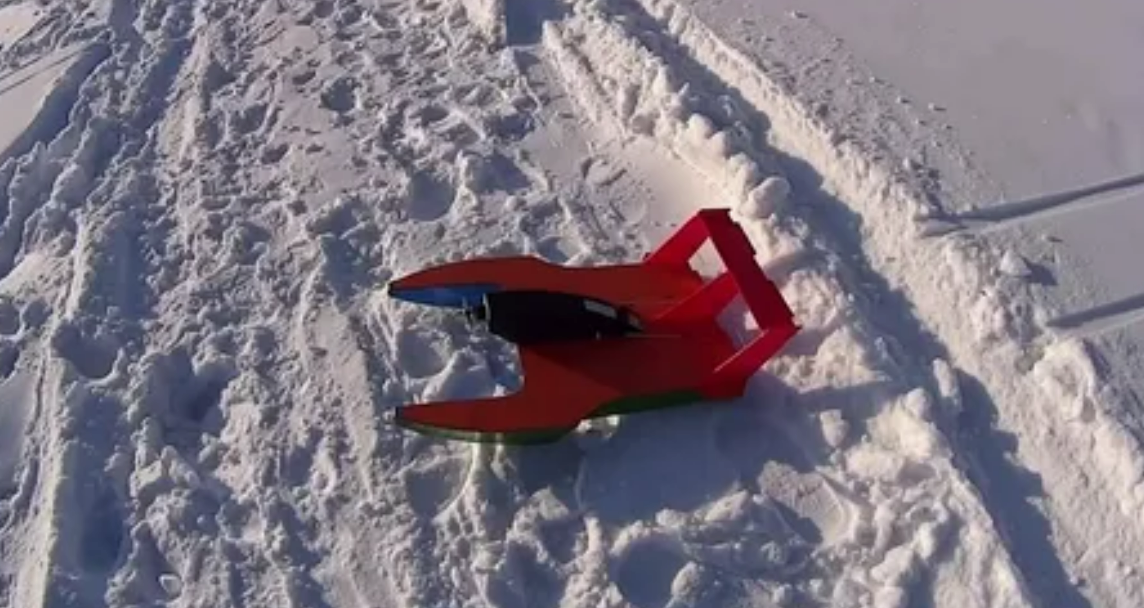 А вот как гоняет аэробот на льду, покрытом не очень толстым слоем снега: