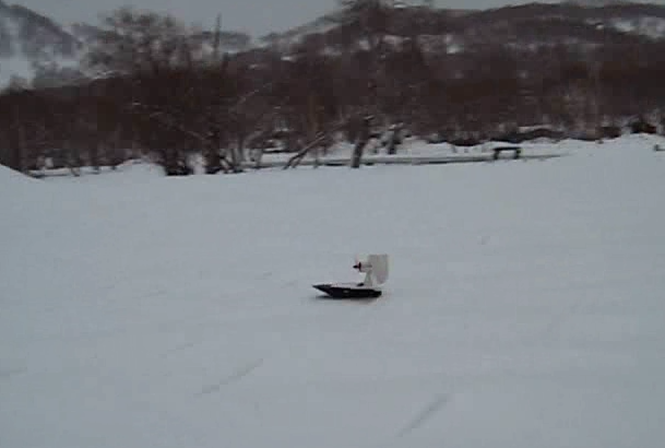 А вот как гоняет аэробот на льду, покрытом не очень толстым слоем снега: